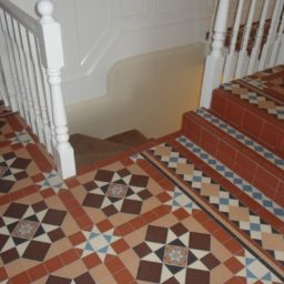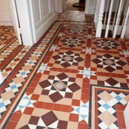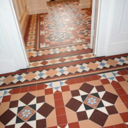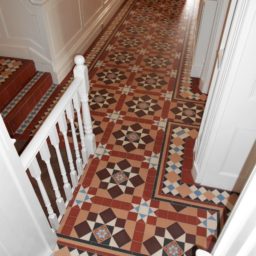 We have recently finished a huge project that spanned two large hallways and a bathroom floor featuring the complicated Chatsworth geometric Victorian tile design that incorporated the Wordsworth border.